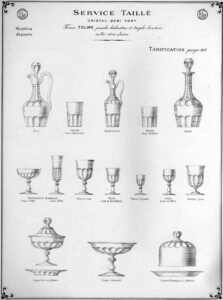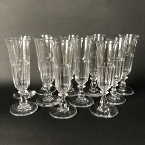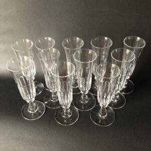 11 flûtes en cristal anciennes. Faites main elles ont des tailles différentes . Très probablement Baccarat , voir dernière photo d’un ancien catalogue de la marque.
