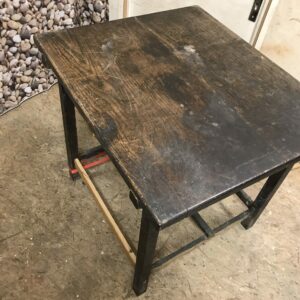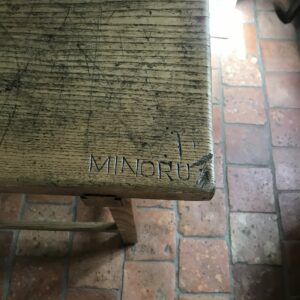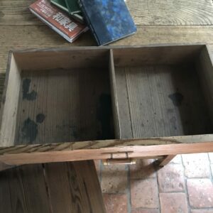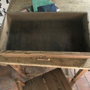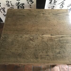 Le plateau porte des traces d’utilisation ,taches et rayures qui suggèrent peut-être aussi une utilisation en cuisine.D’ailleurs pour continuer dans cet usage nous l’avons traitée avec une huile résistante à l’eau .