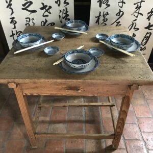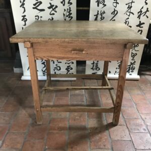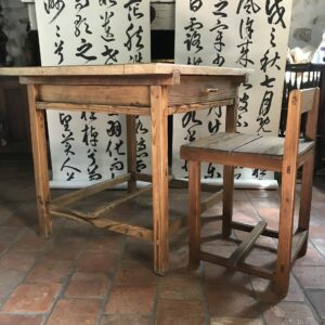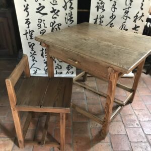 Rare ensemble de mobilier ancien , comprenant une table à deux tiroirs et une chaise. Apparemment une personne était très fière de ses connaissances et a gravé son nom en écriture latine dans un coin : Minoru.