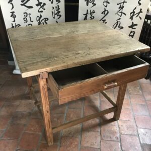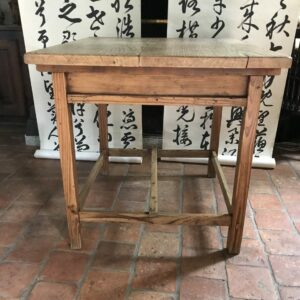 Cette table semble assez carrée et pourtant elle mesure douze cm de plus en largeur.Les deux tiroirs opposés font penser que la table était peut-être prévue pour deux personnes face à face.