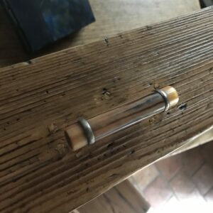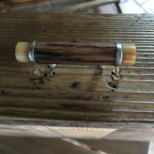 Les poignées en bakélite des années trente ne sont pas d’origine , on voit plusieurs trous des anciennes poignées rebouchés par des petites chevilles en bois .Nous avons changé une traverse avec le même bois Japonais (paulownia),voir sur la dernière photo qui en plus montre l’état dans lequel nous l’avons acheté.
