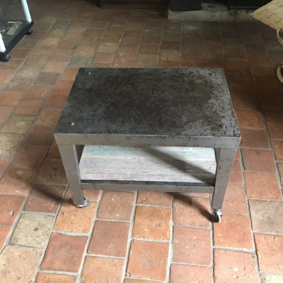 Ref : I 011 Petite table à deux niveaux en acier et bois . A l’origine on empilait des casiers métalliques à tiroirs sur cette base roulante ,d’où la présence des petits plots sur ressorts […]
