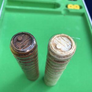 Complet, n’ayant jamais servi, les pions sont en forme de dessus de tonneau et sont encore dans leur emballage.