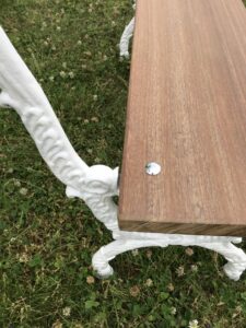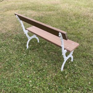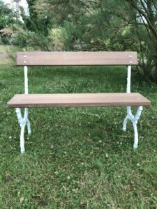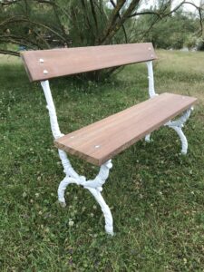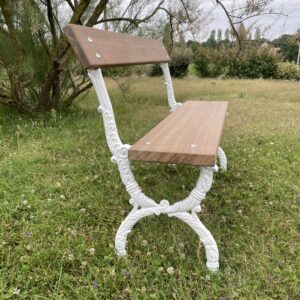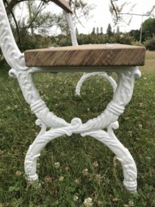 Banc réalisé avec deux pieds en fonte anciens (milieu XIXè) repeints avec une peinture spéciale extérieur.