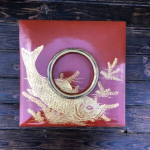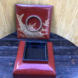 Boîte en bois laqué rouge à beau décor gravé en creux et doré de carpe parmi les végétaux. Quelque usures et petits chocs aux angles et bordures, boursouflure de laque visible photo 3.