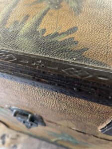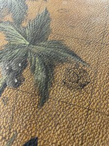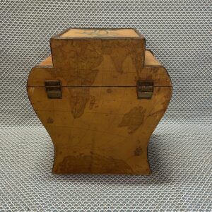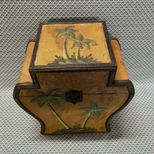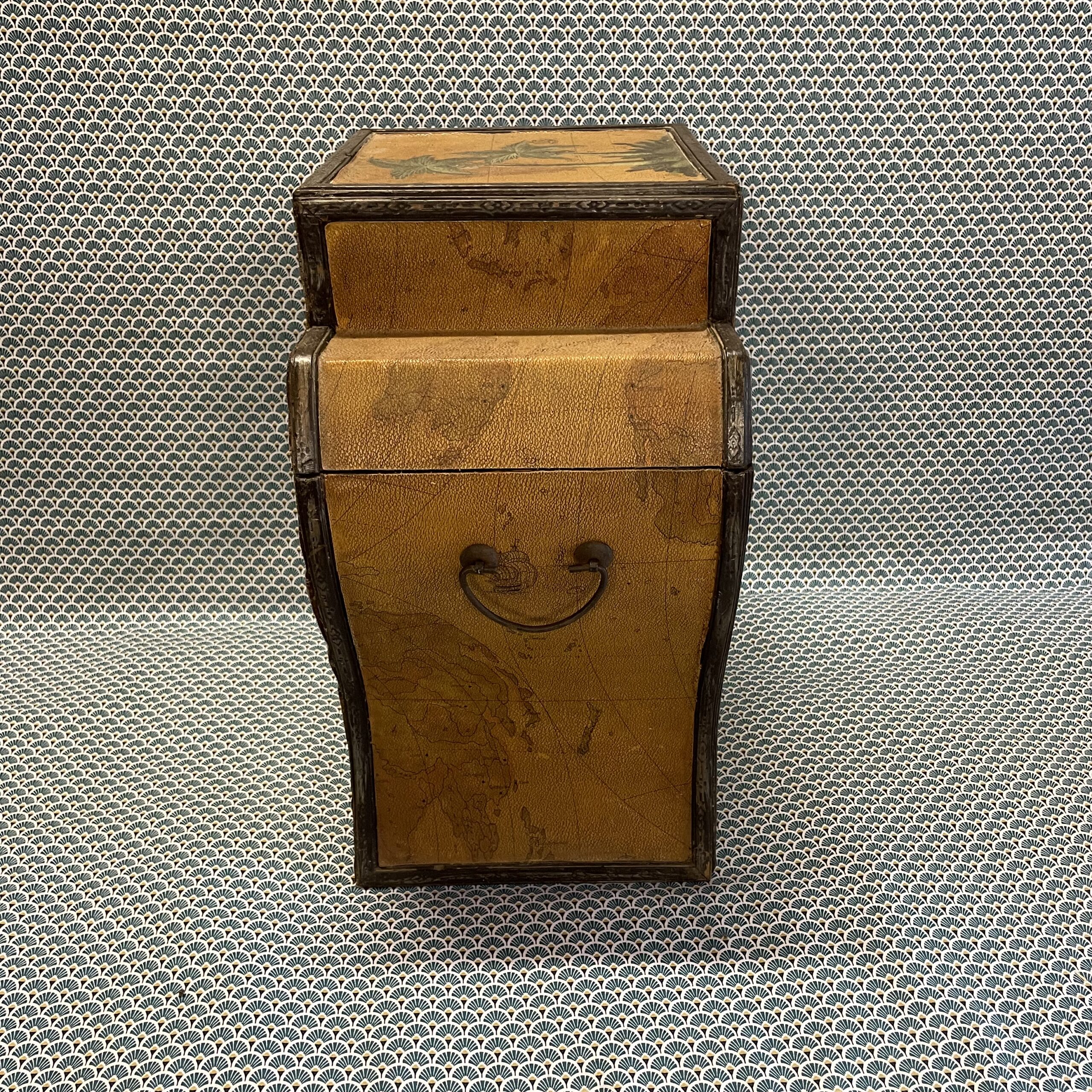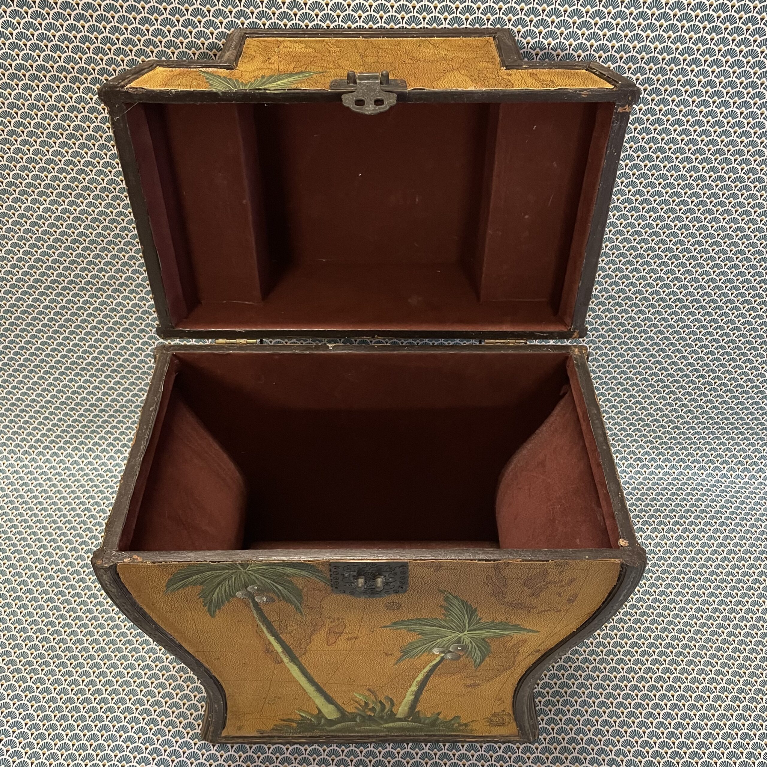Boîte en bois recouverte d’un revêtement de type moleskine à décor de planisphère , rehaussé d’un motif peint de palmiers . Intérieur en velours rouge en bon état, bien qu’un peu défraîchi, dégageant une légère odeur d’anciens parfums.