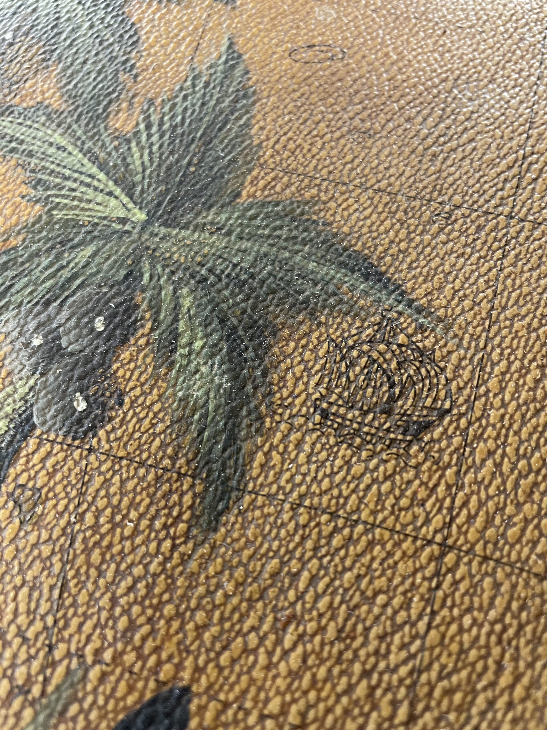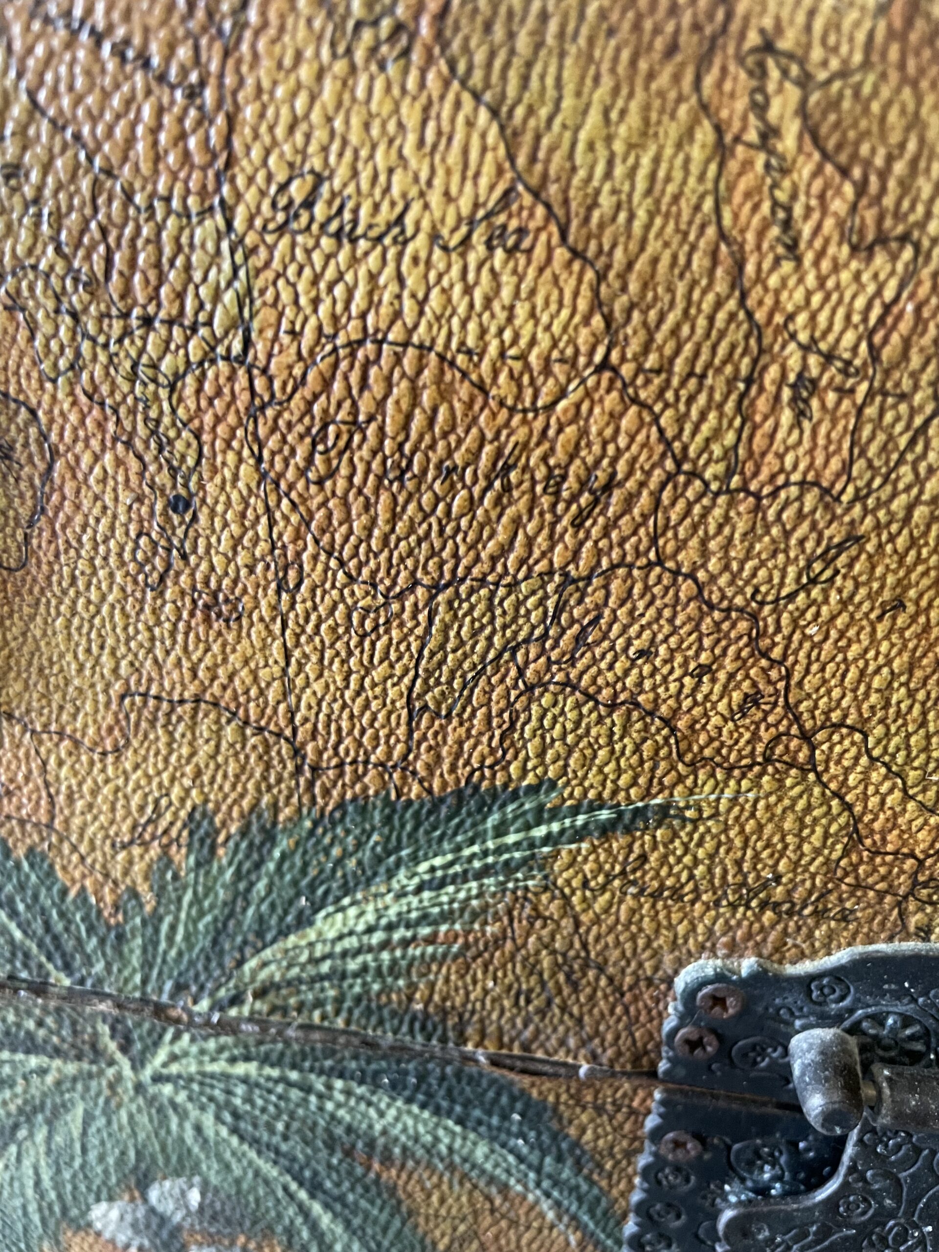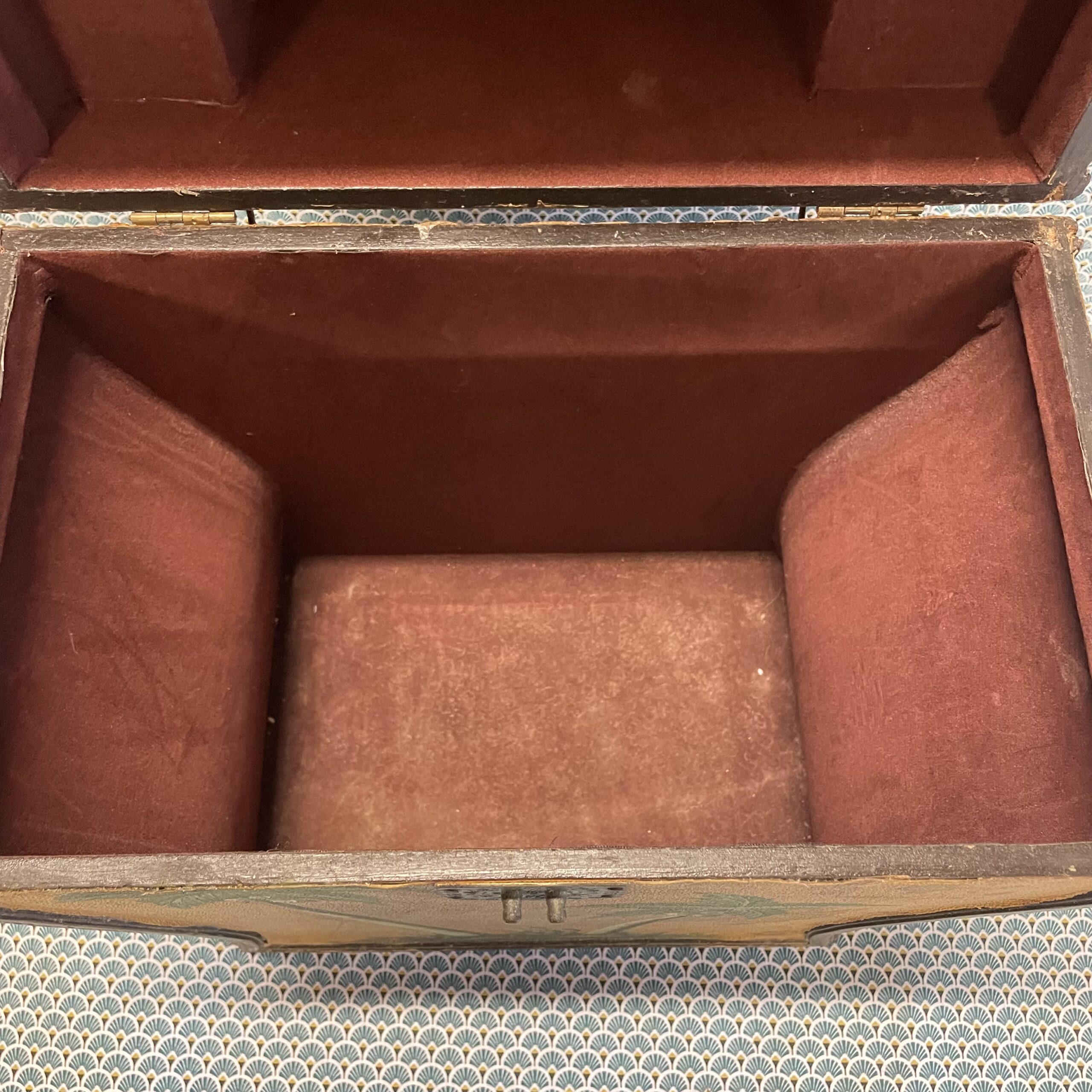 Boîte en bois recouverte d’un revêtement de type moleskine à décor de planisphère , rehaussé d’un motif peint de palmiers . Intérieur en velours rouge en bon état, bien qu’un peu défraîchi, dégageant une légère odeur d’anciens parfums.