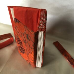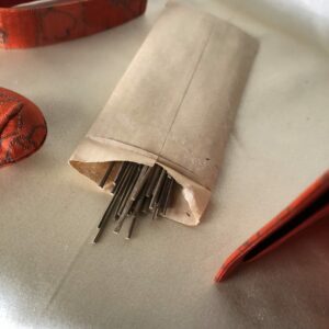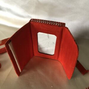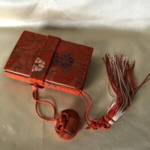 Objet mystère (pour nous) mais tellement raffiné . Se présente comme un petit carnet en sergé de soie maintenu fermé par un coulissant agrémenté d’une « fausse bourse ». Le côté est protégé par une barrette recouverte du même tissu et terminée par un « pompon ».