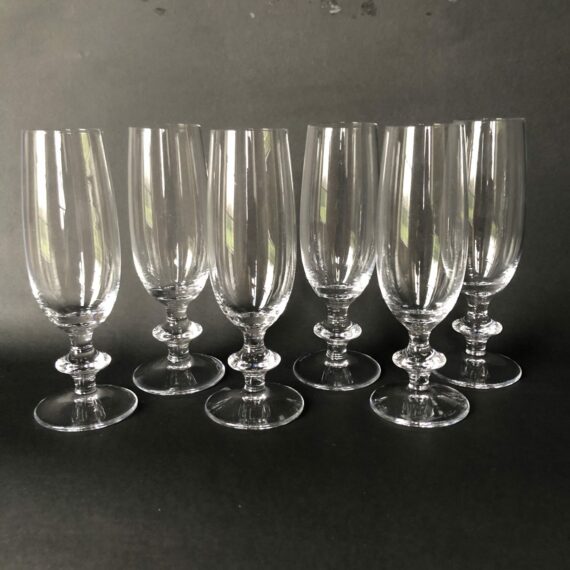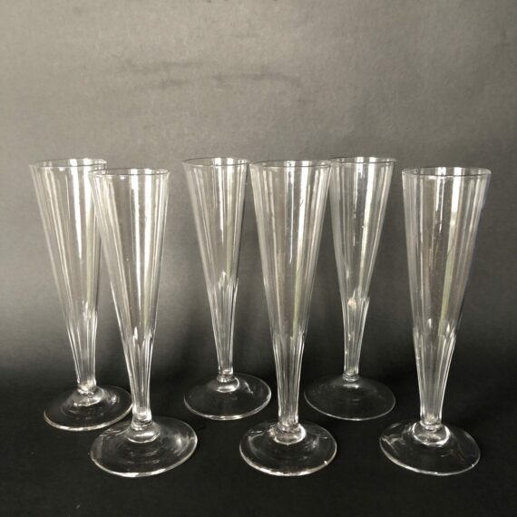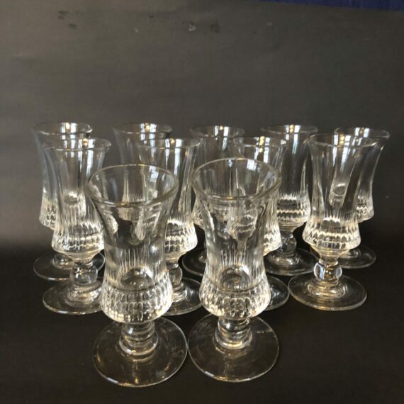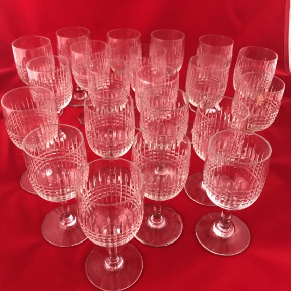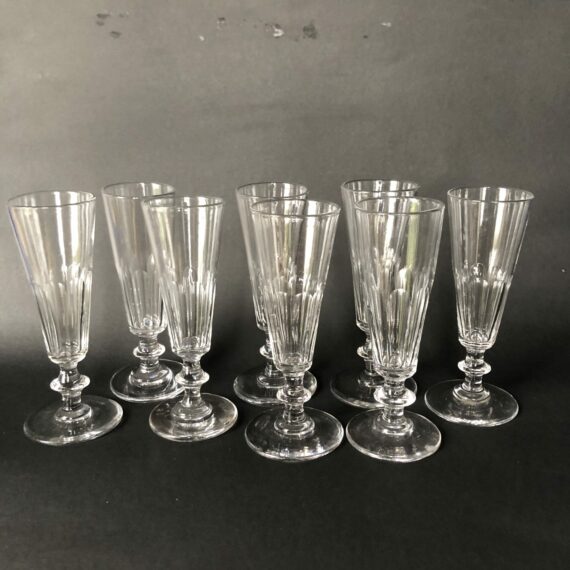 Ref : GV 54 11 flûtes en cristal anciennes. Faites main elles ont des tailles différentes . Très probablement Baccarat , voir dernière photo d’un ancien catalogue de la marque. Hauteur entre 16 […]