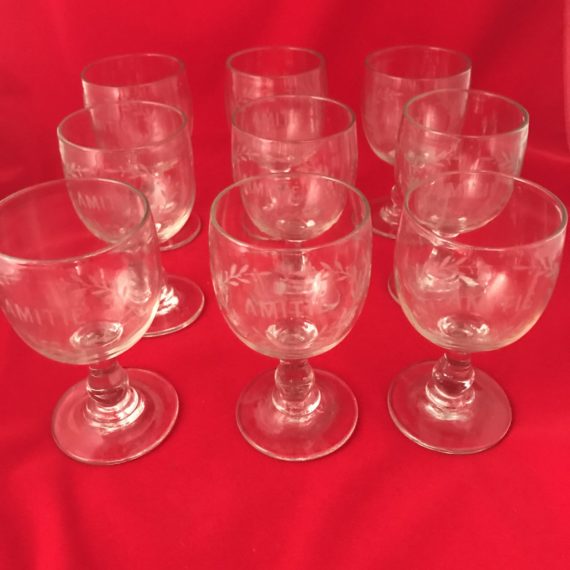 Référence: CV 010 Exceptionnel de trouver neuf verres Amitié anciens au modèle ! Ils étaient souvent offerts à l’unité et jamais achetés en service. Décor sablé de deux branches de gui (?) nouées ensemble. H […]