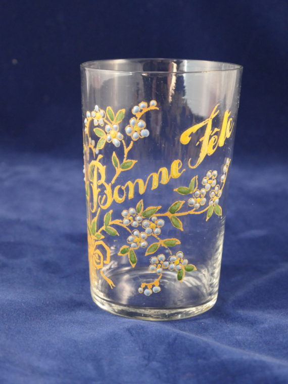 Référence: CV 021 Gobelet en verre émaillé à décor de myosotis souhaitant une bonne fête. Vers 1900 H : 10 cm […]