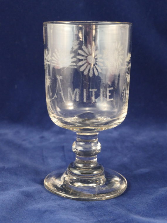 Référence: CV 025 Verre soufflé sur pied boule .Décor sablé « Amitié » dans une vignette entourée de marguerites, modèle peu courant . Début XXème. H : 13,6 cm […]