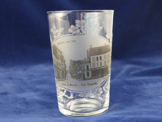 Référence: CV 027 Gobelet en verre , décor gravé à l’acide d’une vue de la Place du Marché et de la rue Gambetta de Breteuil /Iton (Eure) entouré de fleurs . On lit un nom […]