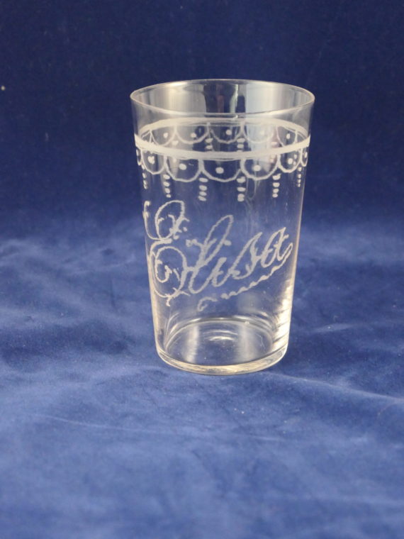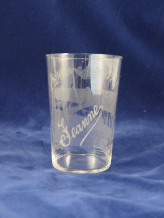Référence: CV 037 Gobelet en verre fin gravé à la roue d’une frise et du prénom « Elisa ». Début XXème. Hauteur : 10,2 cm […]