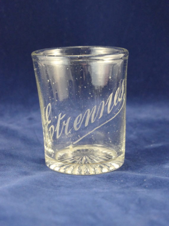 Référence: CV 035 Gobelet en verre très épais et bullé , gravé à la roue « Etrennes » , étoile moulée à chaud sous le fond. deuxième moitié XIXème. Hauteur : 8,2 cm […]