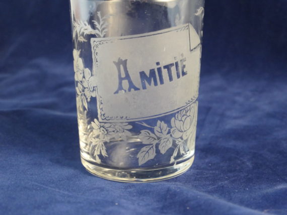 Référence: CV 034 Gobelet en verre fin ,gravure à l’acide Amitié en vignette, décor tournant d’un oiseau et de branchages fleuris. Début XXème H : 9 cm […]
