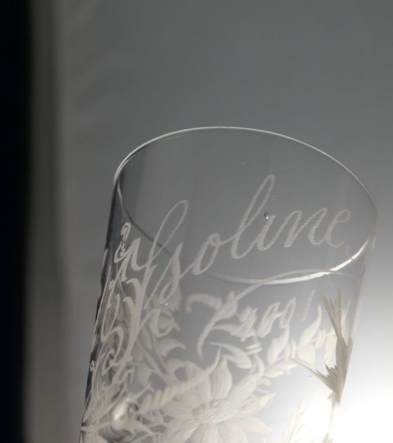 Référence: CV 033 Gobelet en verre fin ,riche gravure à la roue d’un oiseau, branchages fleuris et du prénom Isoline, daté 1901 H : 9 cm […]