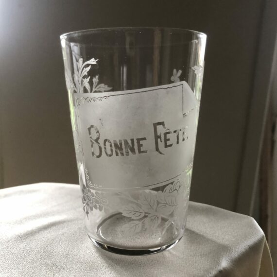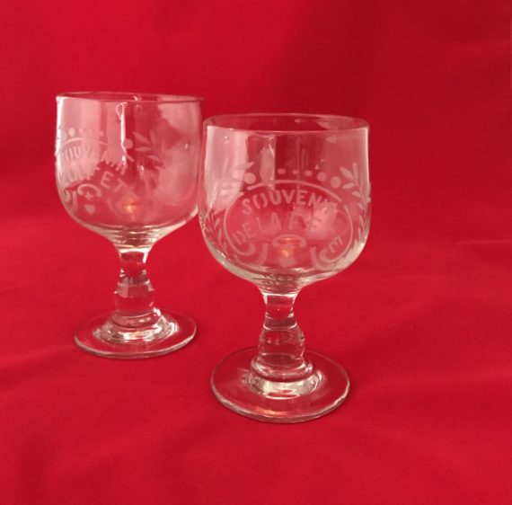 Référence: CV 13 Rare paire de verres soufflés , décor sablé « souvenir de la fête » dans un bandeau avec branchages points et coeur. Verre épais et avec ses imperfections de fabrication. Vers 1900 . […]