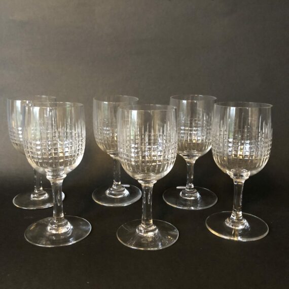 Ref : GV 49 Série de six verres à vin blanc en cristal de Baccarat modèle Nancy. Exemplaires anciens antérieurs à 1936 ,non signés. Une égrénure sur le pourtour de la base de l’un des […]