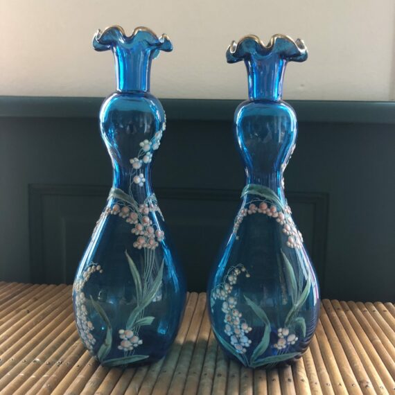 Ref : GV 56 Paire de vases émaillés en verre bleu , en forme de coloquinte très originale .Décor émaillé en relief de brins de muguet , rose et blanc. Col polylobé et doré. Parfait […]
