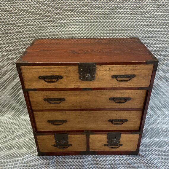Ref : JM 189 Petit meuble ( tansu) de chambre en cryptoméria (sugi) laqué rouge , façades des tiroirs en paulownia. poignées de transport ,serrures et poignées en fer patiné. La laque est particulièrement bien […]