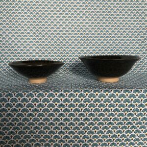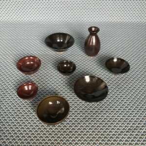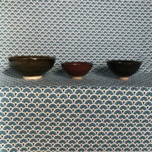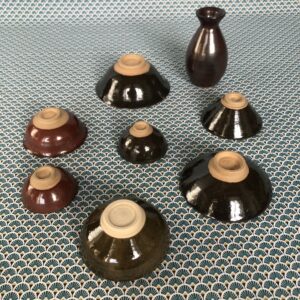Bouteille à saké et divers bols en céramique d’un potier contemporain , voyageant entre France et Japon.