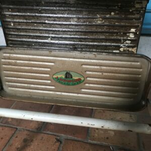 Etat d’usage , traces de peinture, bois écaillé, griffures à la peinture blanche. L’escabeau a été brossé et verni .Fonctionne parfaitement .
