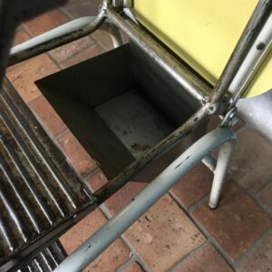 Conçu pour être facilement rangé avec son dossier repliable.Possède un bac sous l’assise, probablement pour aider le bricoleur !