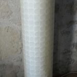 Original lampadaire des années 70 , d’un designer qui nous est inconnu . Pied en plastique blanc , colonne en métal à motifs géométriques , entoilée d’un matériau intissé .