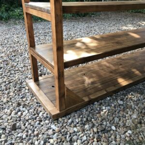 Bon état et bonne stabilité grâce au équerres de renfort à l’arrière. La planche du dessus est un peu cintrée sur la droite ( voir photo 9) mais seulement d’un côté ,on peut donc placer la partie cintrée à l’arrière (voir les autres photos).