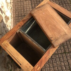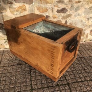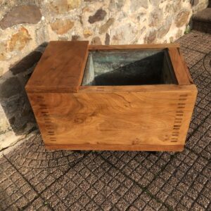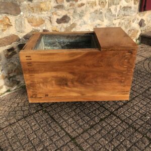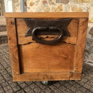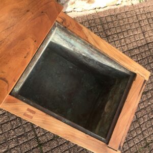 Grand Hibachi entièrement en Zelkova (Orme du Japon).Il est très lourd car les planches en bois massif utilisées mesurent 5 cm d’épaisseur ! Notez également la taille des poignées latérales en fer patiné !