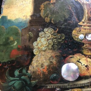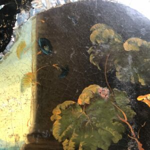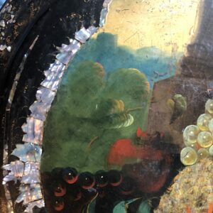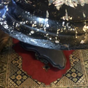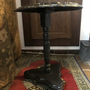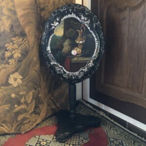 Guéridon d’époque Napoléon III ,plateau en papier mâché avec incrustations de nacre et très belle peinture de nature morte dans le goût du XVIII ème siècle, très finement détaillée . Piètement en bois noirci, avec mécanisme de blocage du basculement en laiton.