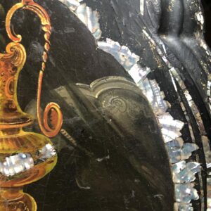 Le basculement permet de transformer le guéridon en tableau posé sur son chevalet, passant ainsi d’une pièce de mobilier utilitaire à une oeuvre d’Art.