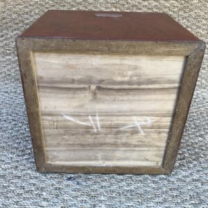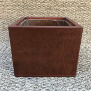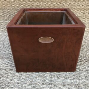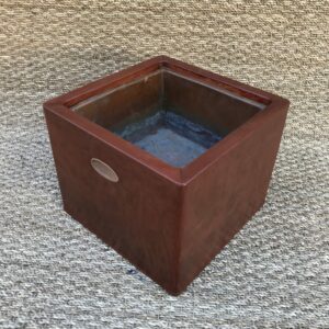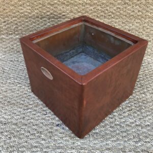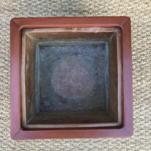 Petit Hibachi carré en bois teinté rouge orangé. Intérieur en cuivre. Servait autrefois de chauffage d’appoint . Peut maintenant aussi servir de jardinière.