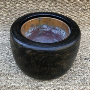 Bel Hibachi rond ,braséro Japonais ,en bois de paulownia patiné, intérieur en cuivre .Ces petits hibachis étaient facilement transportables d’une pièce à l’autre afin d’assurer un apport de chaleur au plus proche.