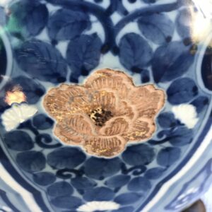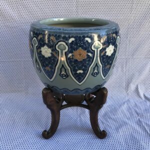 Décor floral en bleu sous couverte, émail céladon et blanc . Fleurs incisées , certaines non émaillées.Parfait état ( les taches cuivrées sont les reflets du soleil du jour ! – nous faisons le plus possible les photos en extérieur car les couleurs sont plus fidèles)