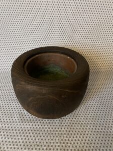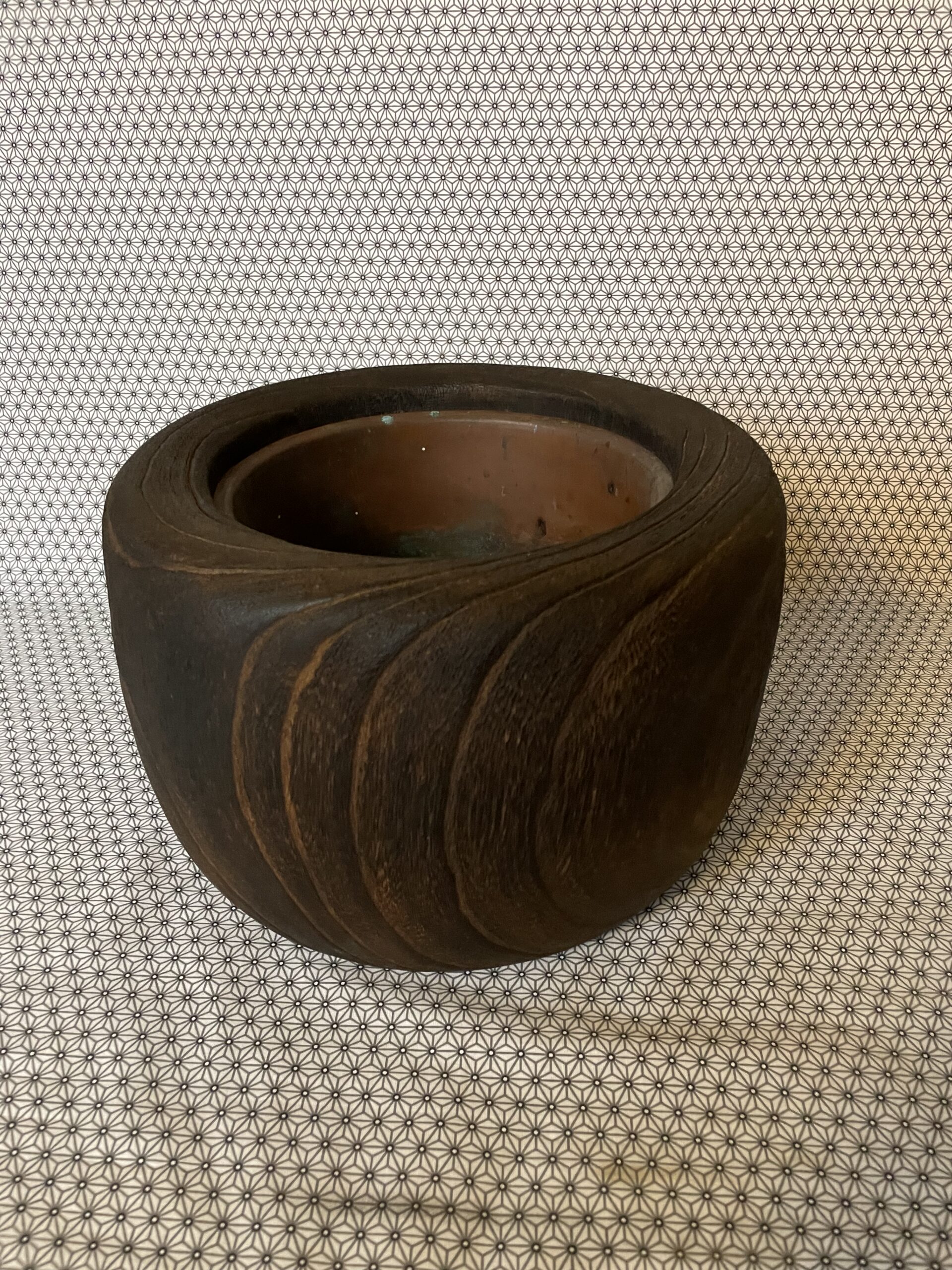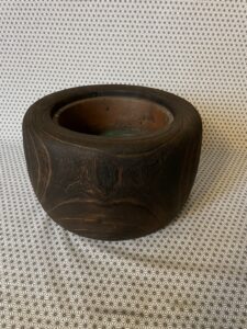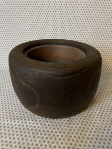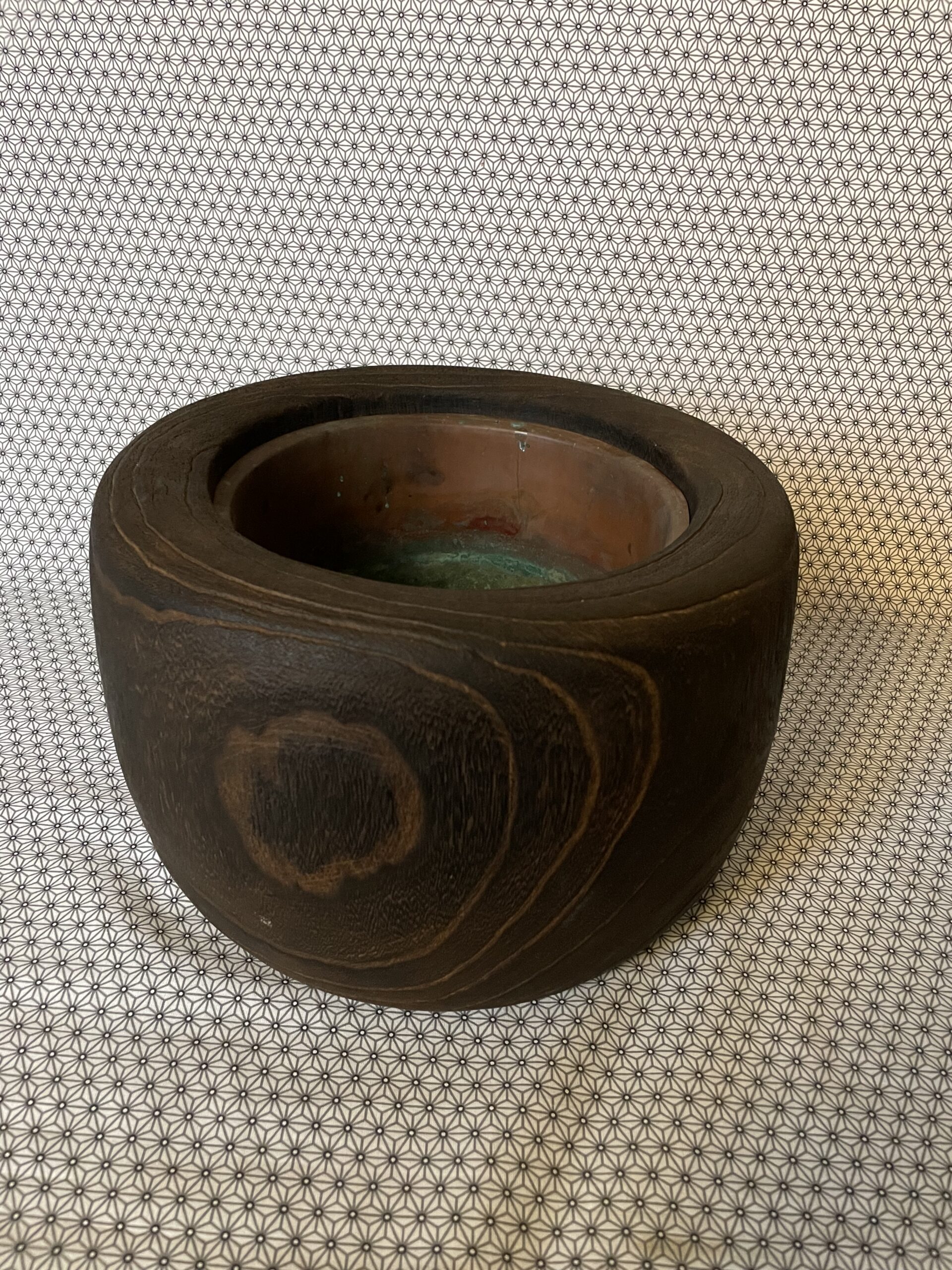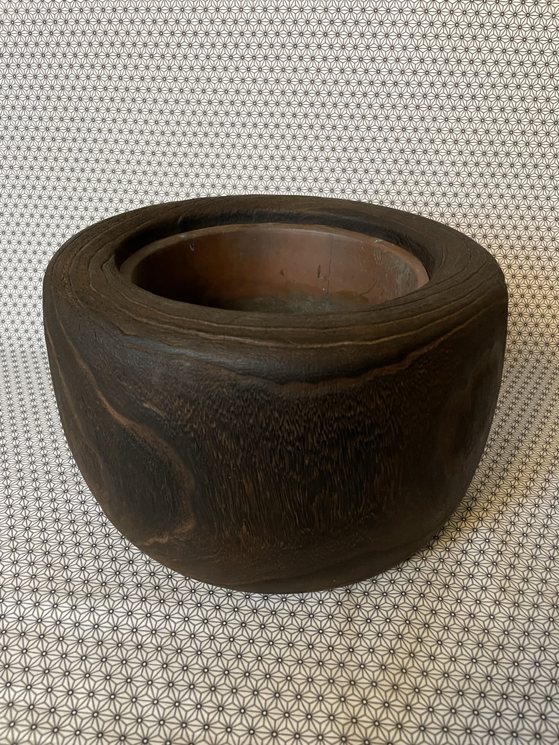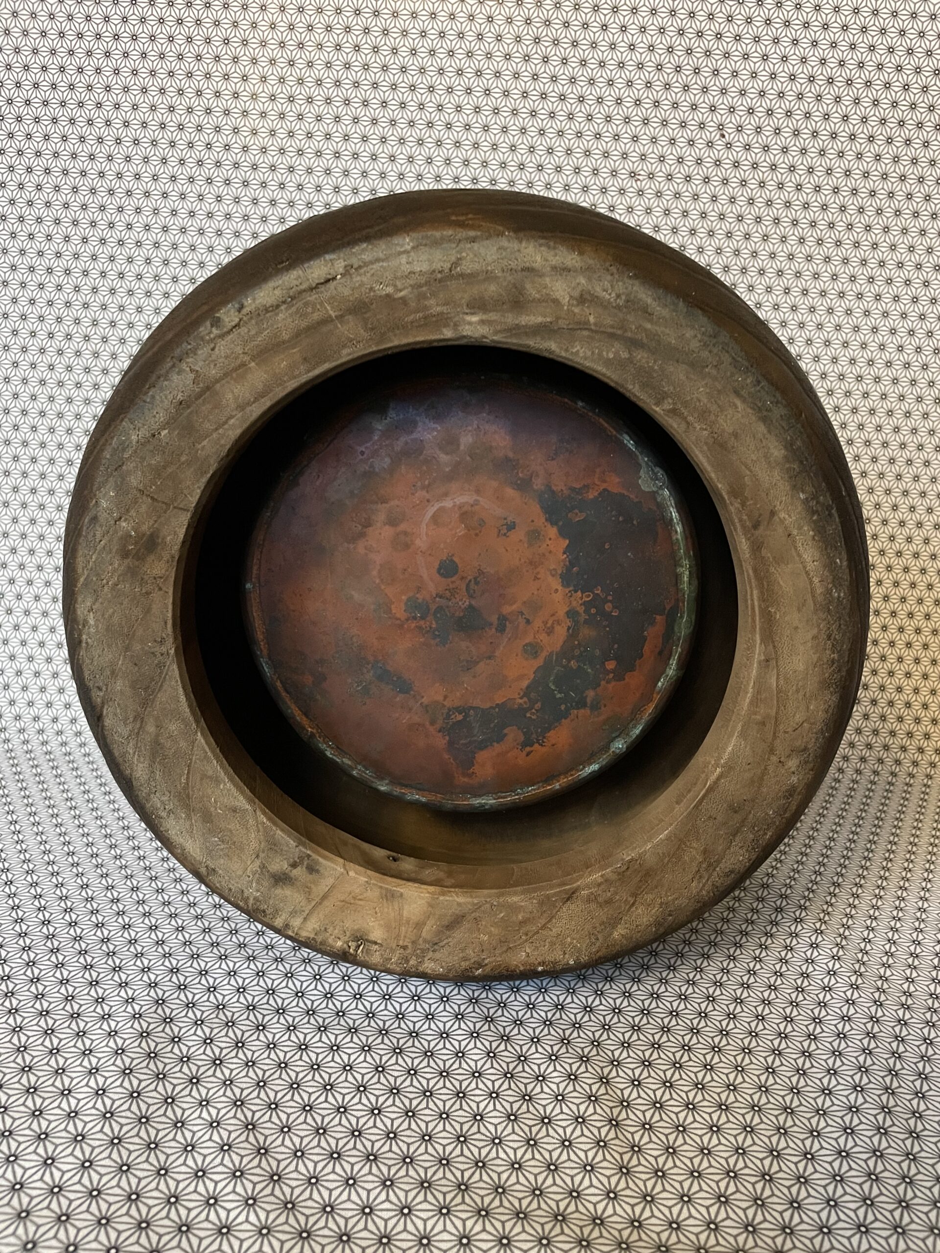 Bel Hibachi rond ,braséro Japonais ,en bois de paulownia patiné, intérieur en cuivre .Directement tourné dans un tronc entier on peut bien apprécier les cernes du bois .Du fait de la très grande légèreté du paulownia ces petits hibachis étaient facilement transportables d’une pièce à l’autre afin d’assurer un apport de chaleur au plus proche.Egalement utilisé pour faire chauffer l’eau lors de la cérémonie du thé.