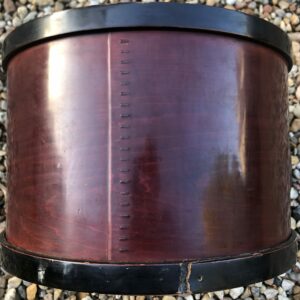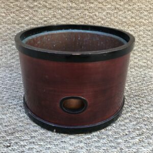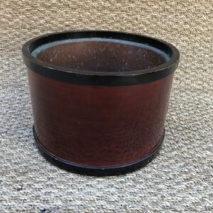 Hibachi cylindrique laqué rouge à deux tons , braséro Japonais traditionnellement utilisé comme chauffage mobile. Composé d’une feuille de bois enroulée sur elle même et agrafée ( voir photo 4). Fond et rebord supérieur fabriqués de même. Deux ouvertures latérales formant prises de transport.