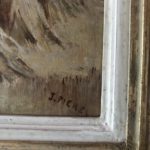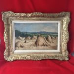 Huile sur isorel signée en bas à droite et au dos J. Pierel . Paysage champêtre de meules de foin situé à Haute Saive (Belgique près de Liège). Les meules sont faites à la main ce qui indiquerait une date antérieure à 1950 .