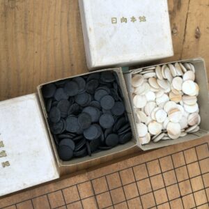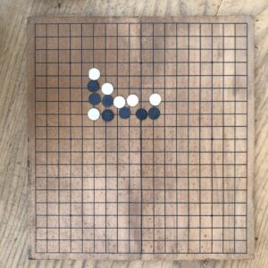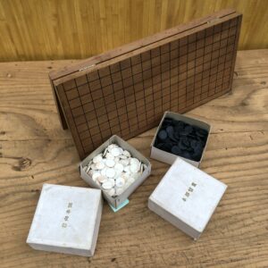 Jeu de Go avec goban pliant , deux boîtes de pierres très anciennes . Les noires sont en ardoise, les blanches en coquillages (accidents). Ils n’y a que 163 blanches au lieu de théoriquement 180 ,les noires sont au bon nombre de 181. Pourquoi tant de pierres, 361 ?? ….. parce qu’il y a 361 intersections sur le plateau ( je l’ai compris il y a peu donc je fais mon intéressant) .