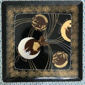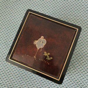 Magnifique boîte à bento avec 2 compartiments, richement décorée de grues qui symbolisent la paix, la chance et la longévité. Elles sont représentées pendant leur danse de séduction lorsqu’elles déploient majestueusement leurs ailes et étirent leur cou avec délicatesse.