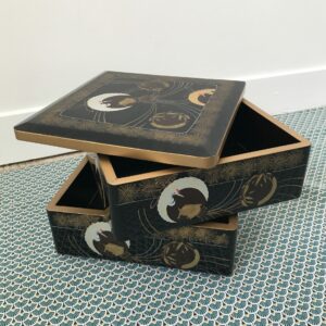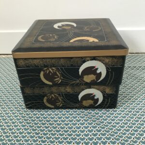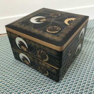 Cette boîte à bento provient d’un ancien fonds de magasin . Elle n’a visiblement jamais servie, d’où son état exceptionnel, emballée dans un papier délicat à l’intérieur de la boîte de transport d’origine.