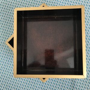 Belle laque noire à l’extérieur. Laque intérieure de couleur brun rougeâtre irisé ainsi que le fond de la boîte.