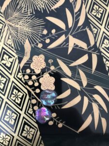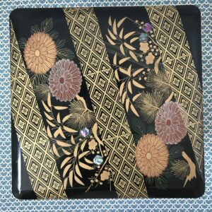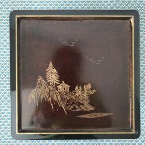 Des pastilles de nacre (20 en tout) sont apposées sur le décor et l’intérieur du couvercle est décoré d’un paysage japonais avec vols de grues dans le ciel.