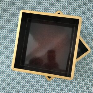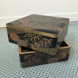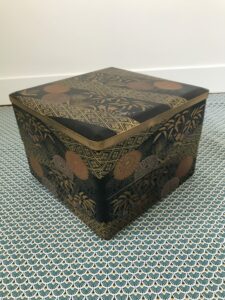 Très belle qualité de la laque: noire à l’extérieur et brun rougeâtre irisé à l’intérieur et sur le fond de la boîte.