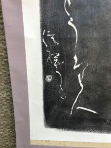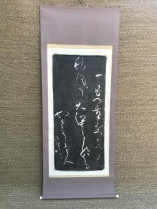 Kakejiku ou kakemono Japonais Ref : JD 151 Kakejiku ou Kakemono à décor de caractères Japonais blancs sur fond noir. Pliures visibles sur les photos. Dimensions : 199 x 78 cm Prix : 45 Euros Livraison gratuite en point relais en France. Autres destinations nous consulter.
