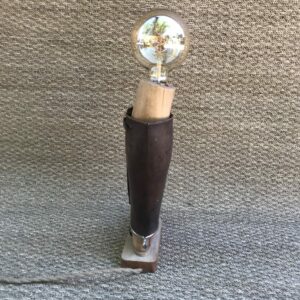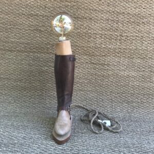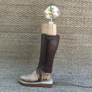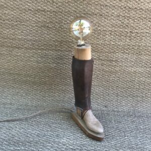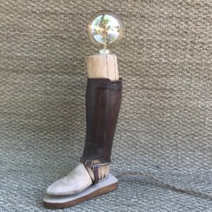 Lampe réalisée à partir d’un embauchoir de botte d’équitation en bois de hêtre sur lequel on a rajouté un éperon et une « guètre » , ces deux éléments pouvant être démontés.