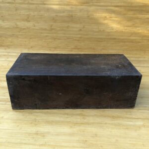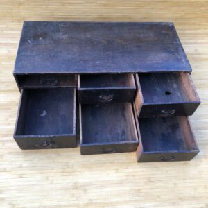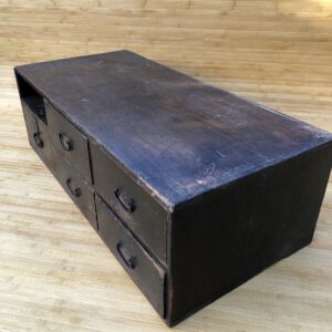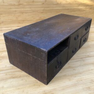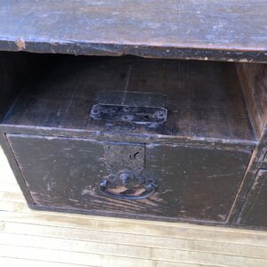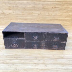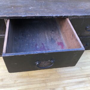Meuble de commerçant « dans son jus » en bois de paulownia laqué . Cinq tiroirs et un casier avec une fente permettant de glisser l’argent des transactions dans le seul tiroir fermant à clef – faisant donc office de coffre-fort. L’intérieur de ce casier est laqué ce qui n’est pas le cas pour les intérieurs des tiroirs. Nous ne possédons pas la clef.