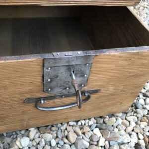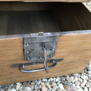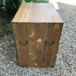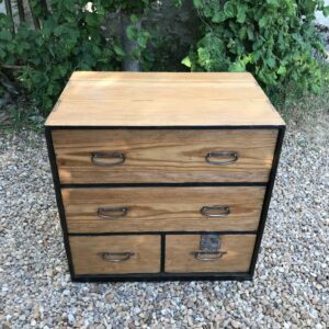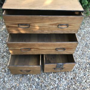 Petite commode en cyprès du Japon (Hinoki) à quatre tiroirs dont un fermant à clef ( clef fonctionnelle mais non d’origine). Elle est un peu inhabituelle du fait de sa profondeur un peu plus importante que la moyenne des « petits » meubles Japonais.Bordure laquée noire en façade. Très bon état.