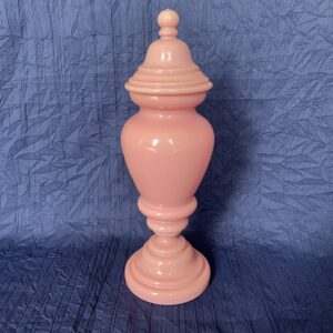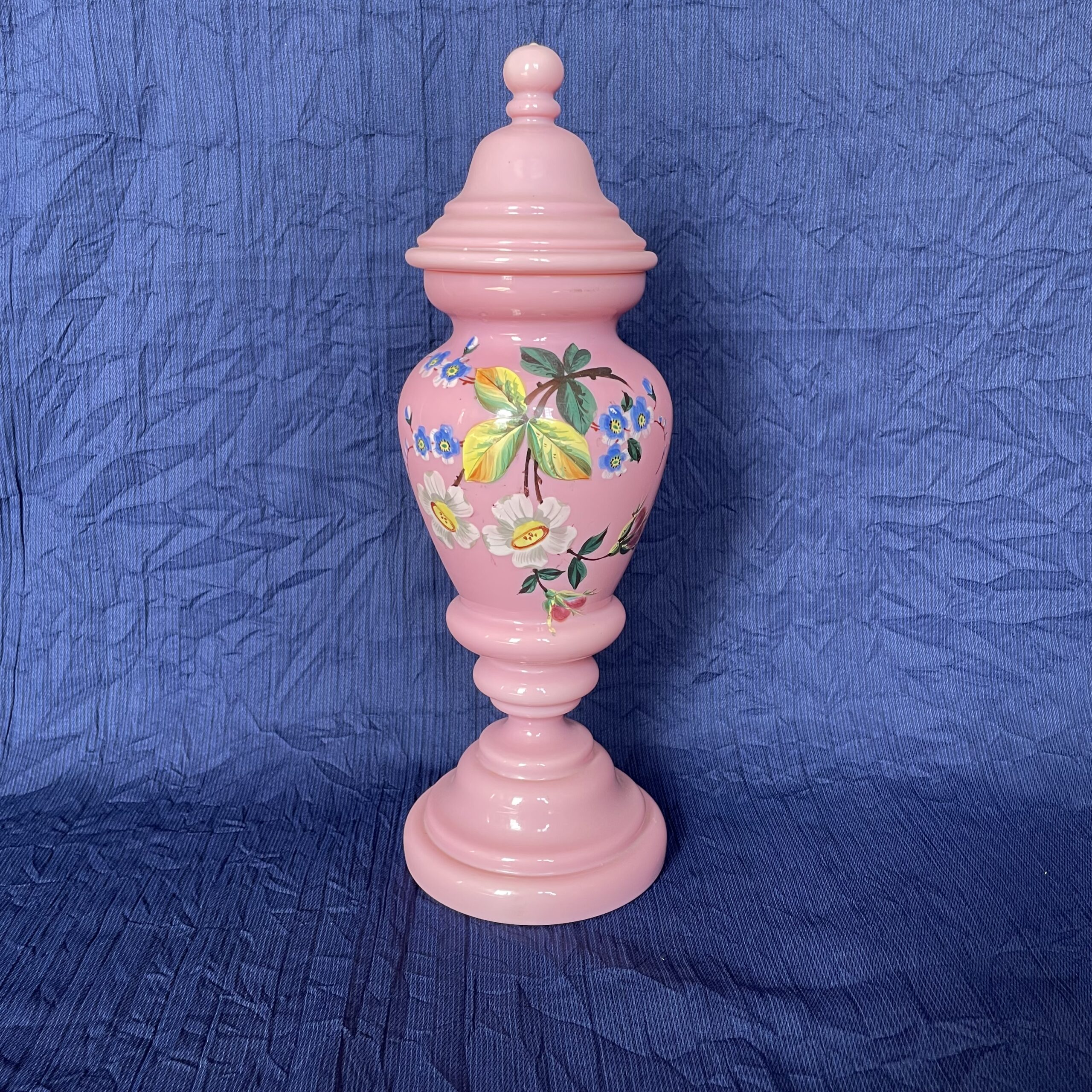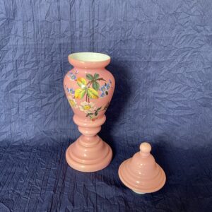Beau pot couvert en opaline à décor floral émaillé . Belle taille et rare couleur rose (un peu plus soutenue que sur la photo 1 , les autres ont un teint jaune dû à mes mauvaises qualités de photographe). Très bon état ,pas de fêles ni d’égrénures, quelques (4) bulles de cuisson dans le décor floral bleu.